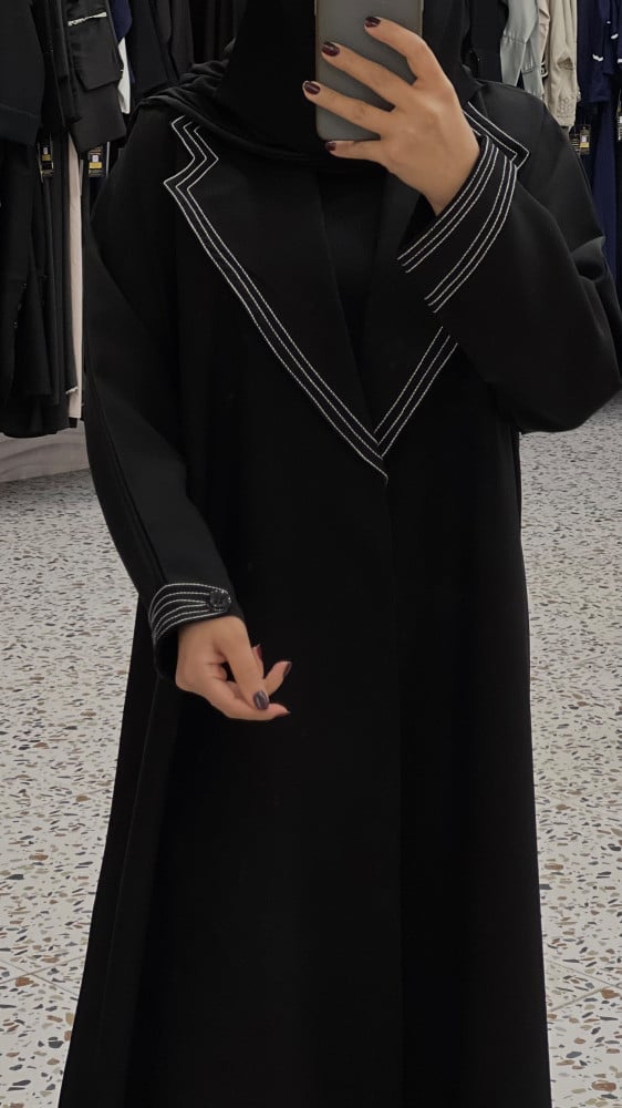 عباية كتان كلوش بياقة مع تطريز ابيض
